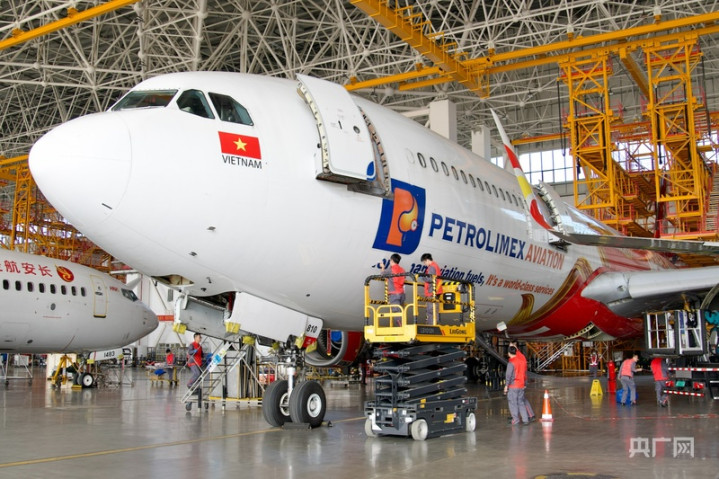 海南自贸港一站式飞机维修产业基地工作人员对进境飞机执行检修(央广网记者蔡文娟摄)